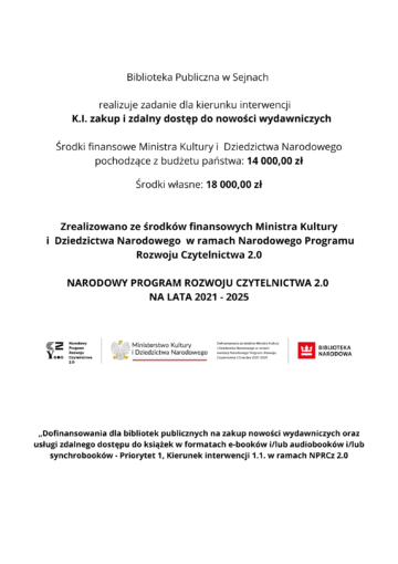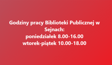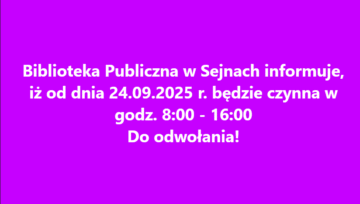 Biblioteka Publiczna w Sejnach mieści się w nowym budynku Ośrodka Kultury w Sejnach przy ulicy 1-go Maja (wejście przez łącznik […]